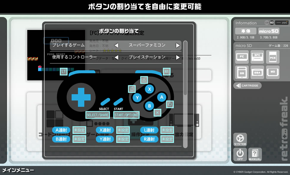レトロフリークではプレイするゲームシステムと使用するコントローラーの組み合わせは自由に変更可能。ボタンの割り当ても使用するコントローラーに合わせてボタン1つ1つ変更でき、連射ボタンの設定や連射速度の変更も可能です。ユーザーの皆様自身が最も使いやすいコントローラーで、好きなゲームを遊ぶことができます。