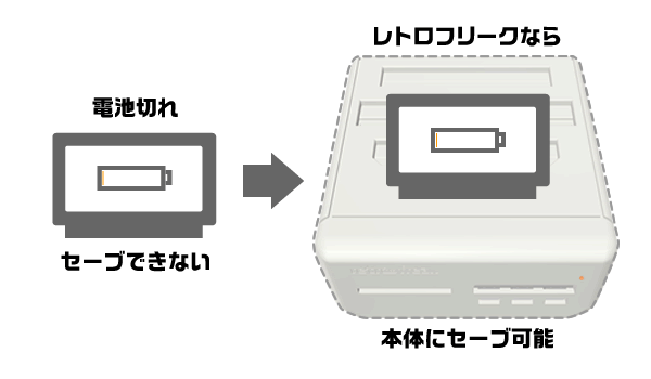 バッテリーバックアップの電池が切れてセーブできなくなったカートリッジでも、レトロフリークでプレイしたゲームのセーブデータは、レトロフリーク本体にセーブできます。