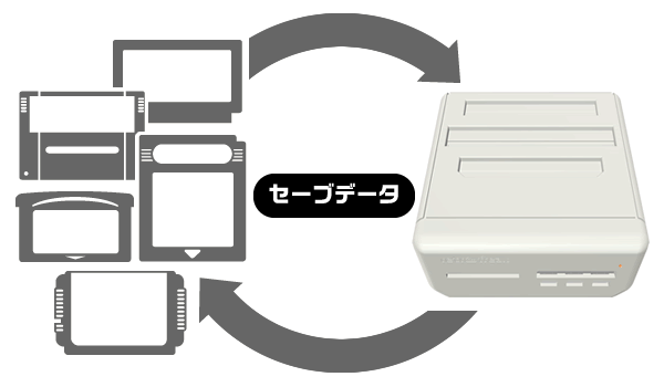 カートリッジからレトロフリークにセーブデータを取り込んだり、レトロフリークに保存されているセーブデータをカートリッジに書き出したり、セーブデータの相互移動が可能です。