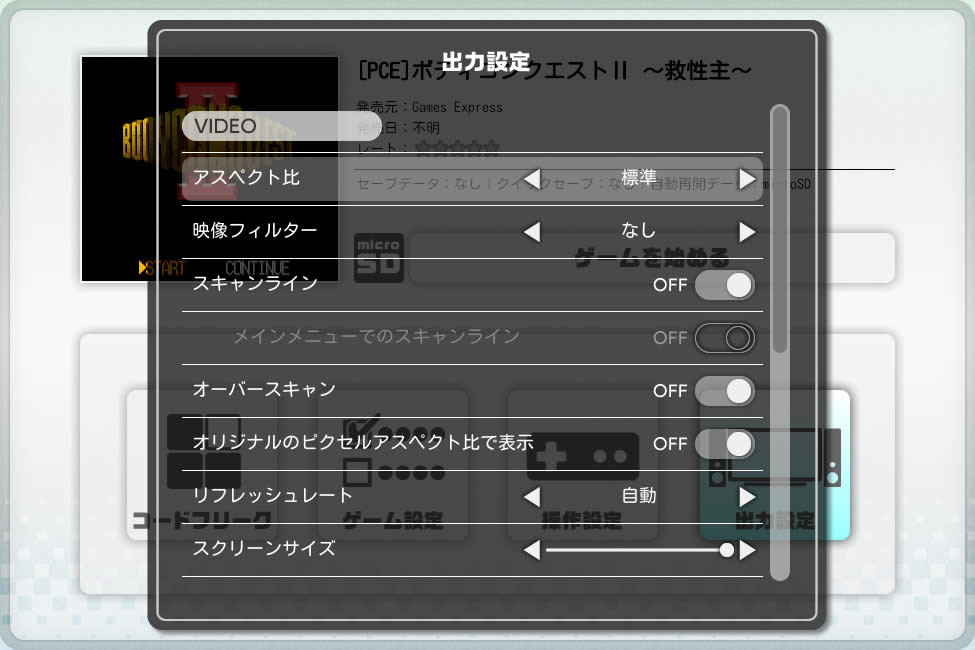 ファミコンやスーパーファミコンはもちろん、メガドライブやPCエンジンなどのゲームに対しても、無敵やレベルMAXなどの状態にできるコードフリーク機能を使えます。コードフリーク機能を使用する場合は、別途microSDカードとインターネットに接続できるパソコンが必要。いわゆるチート行為ですね。楽しみ方の幅が広がる魅力的な機能です。